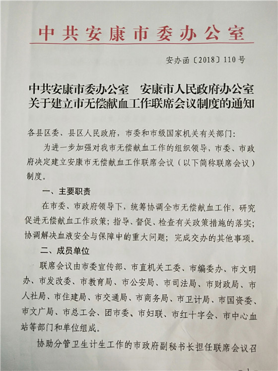 2、安康市率先在全省建立首個無償獻血聯(lián)系會議制度 安康無償獻血聯(lián)席會議制度是在安康市委、市政府領(lǐng)導(dǎo)下,由市委宣傳部等21個市級部門和單位組成,協(xié)助分管衛(wèi)生計生工作的市政府副秘書長擔(dān)任聯(lián)席會議召集人。聯(lián)席會議每年召開一次全體會議,主要職責(zé)為統(tǒng)籌協(xié)調(diào)全市無償獻血工作,研究促進無償獻血工作相關(guān)政策,指導(dǎo)、督促、檢查有關(guān)政策措施的執(zhí)行落實,協(xié)調(diào)解決血液安全與保障中的重大問題。聯(lián)系會議制度的建立,標志著我市無償獻血宣傳招募模式“政府主導(dǎo)、部門協(xié)作、社會參與、城鄉(xiāng)聯(lián)動”的發(fā)展格局和長效機制得到進一步鞏固和提升。