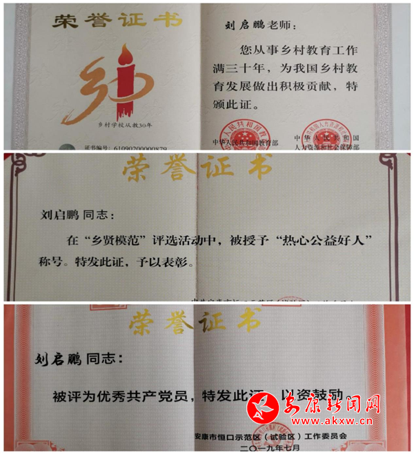 劉啟鵬先后獲得教育部、人力資源和社會(huì)保障部授予“鄉(xiāng)村學(xué)校從教30年”榮譽(yù)證書,被區(qū)鎮(zhèn)評為“鄉(xiāng)賢模范”和“優(yōu)秀共產(chǎn)黨員”等先進(jìn)個(gè)人。