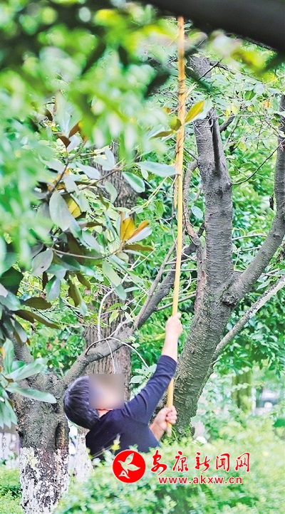 市民拿著長桿在景區(qū)附近采摘果實(shí)