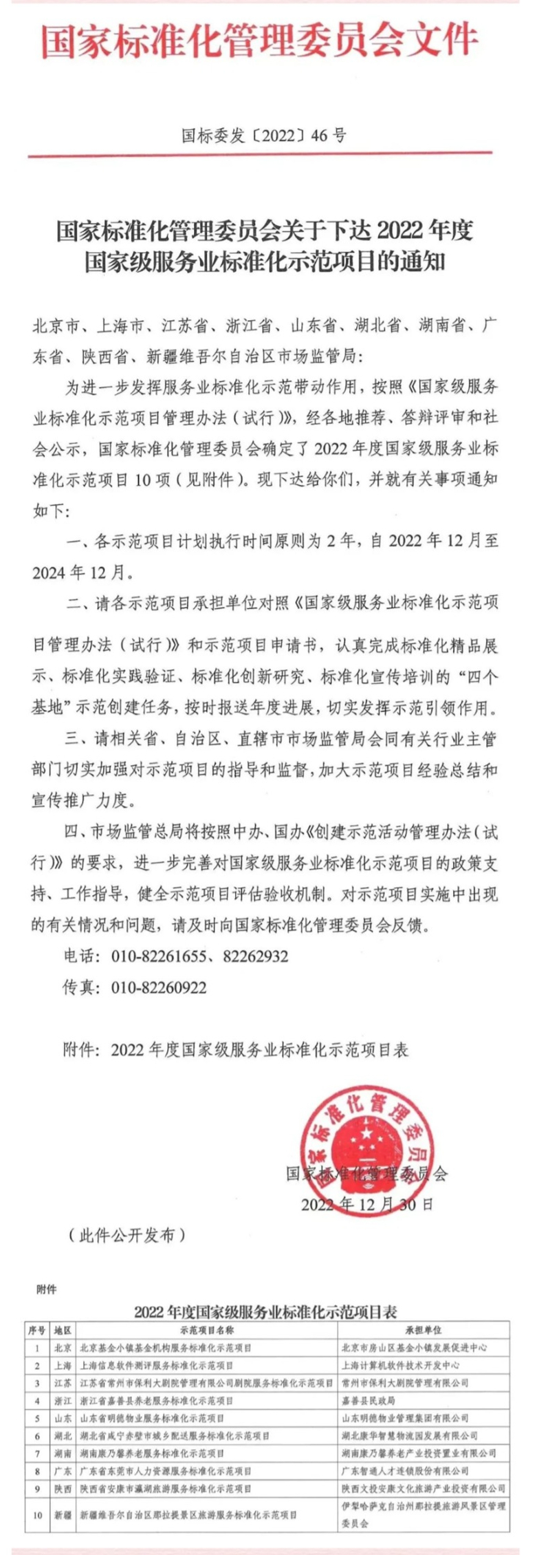 2022年12月30日,國家標(biāo)準(zhǔn)化管理委員會下達(dá)全國十個(gè)國家級服務(wù)業(yè)標(biāo)準(zhǔn)化示范項(xiàng)目,“陜西省安康市瀛湖旅游標(biāo)準(zhǔn)化示范項(xiàng)目”,經(jīng)過資審、文審、選拔、答辯、公示等程序,從全國一百余家單位中脫穎而出、光榮上榜,成為陜西省第一個(gè)國家級旅游標(biāo)準(zhǔn)化示范項(xiàng)目。