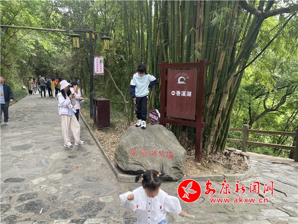 “樓閣云中建,竹木藏山巔?!薄拔逡弧逼陂g,風(fēng)景優(yōu)美、距離城區(qū)較近的香溪洞風(fēng)景區(qū)也迎來(lái)了“游客潮”。在眾多自覺(jué)遵守文明出行規(guī)則的游客中,一孩童隨意踩踏在景觀石頭上,和溫馨提示牌上的“愛護(hù)環(huán)境,文明出行”形成鮮明對(duì)比。