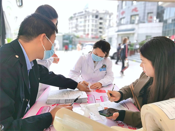 早上9點(diǎn),列隊(duì)等候的醫(yī)務(wù)工作者們在獻(xiàn)血車前,井然有序的進(jìn)行信息登記、健康征詢、血壓測量等程序。他們中有多次獻(xiàn)血的“老兵”,也有首次獻(xiàn)血的年輕職工,有的剛下夜班,有的趁工作間隙,還有的則放棄了休息趕來。大家紛紛表示,無償獻(xiàn)血就是以實(shí)際行動(dòng)踐行廣大醫(yī)護(hù)人員的初心使命,為老百姓的生命健康保駕護(hù)航。