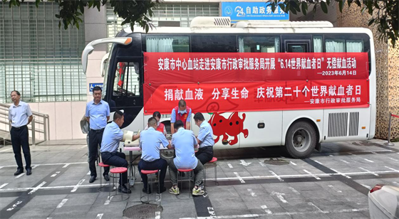 2023年6月14日,在第二十個(gè)世界獻(xiàn)血者日當(dāng)天,安康市中心血站聯(lián)合市行政審批服務(wù)局開展了“文明有我 無(wú)償獻(xiàn)血 傳遞溫暖”無(wú)償獻(xiàn)血志愿服務(wù)活動(dòng)。