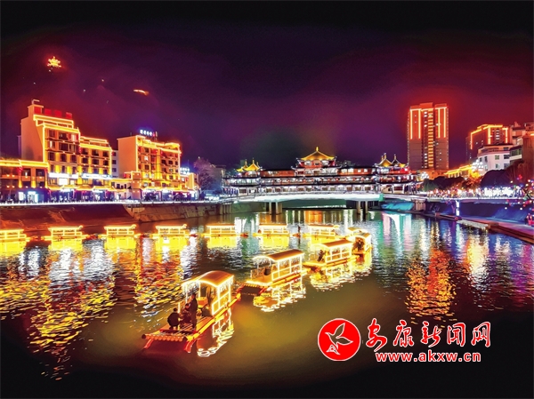 夜色漸濃,河堤兩岸被千盞燈籠裝飾一新,吉祥如意景觀燈廊,十二生肖、盛世龍門(mén)等各式造型的燈飾以及十二生肖竹排,與嵐河、廊橋交織成一片璀璨星河,如夢(mèng)如幻。不少市民游客駐足觀看、拍照打卡。