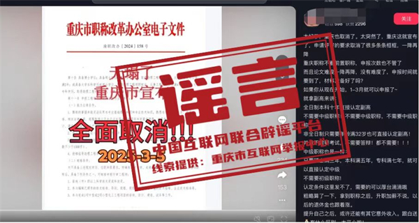 真相:近日,有網(wǎng)民在互聯(lián)網(wǎng)平臺(tái)發(fā)布消息稱“重慶市宣布,申請?jiān)u審的要求取消了很多條條框框,職稱申請不看前置職稱,全日制本科十年直接認(rèn)定副高,不需要中級(jí)職稱”,引發(fā)關(guān)注。經(jīng)核實(shí),網(wǎng)傳信息系謠言。職稱評(píng)審均需逐級(jí)晉升,取得上一級(jí)職稱并滿足相應(yīng)學(xué)歷資歷條件后方可晉升高一級(jí)職稱。目前重慶市除特殊人才、博士后等3個(gè)針對特定對象的職稱申報(bào)綠色通道外,正常申報(bào)通道均需逐級(jí)晉升。網(wǎng)傳文件是網(wǎng)民通過P圖軟件編輯而成,試圖吸引不明真相的群眾咨詢,借機(jī)推銷職稱代辦服務(wù),收取高額費(fèi)用。目前,謠言線索已轉(zhuǎn)交公安機(jī)關(guān)進(jìn)一步調(diào)查處置。(來源:“重慶辟謠”微信公眾號(hào))