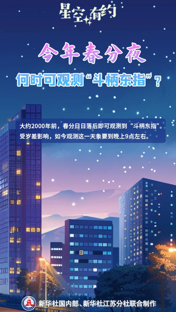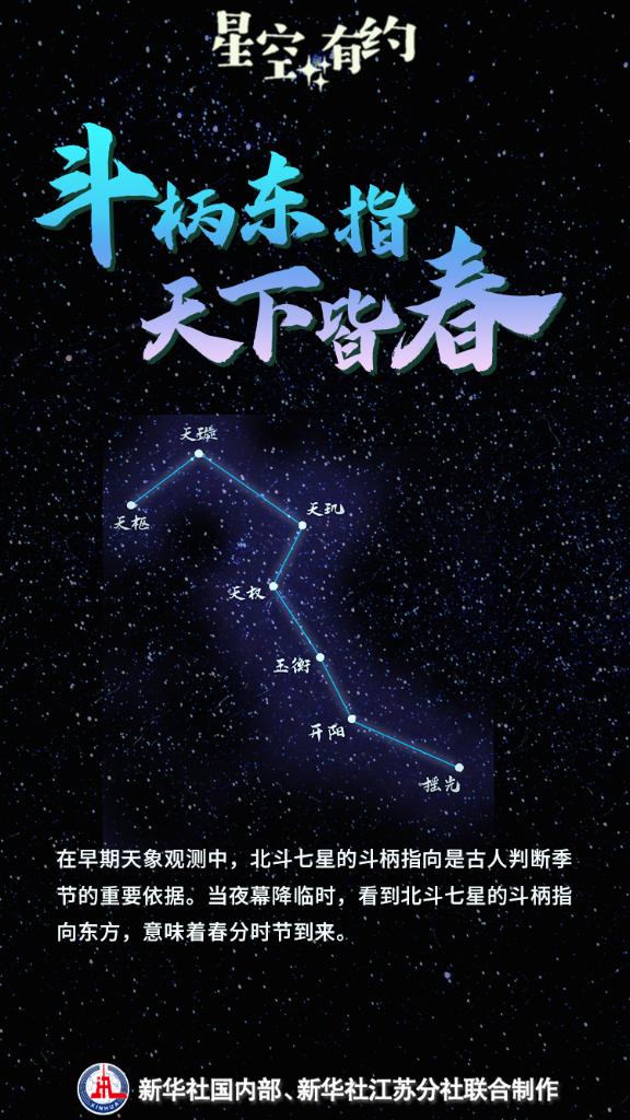 3月20日將迎來春分節(jié)氣。這一時(shí)節(jié)草長鶯飛、花滿枝頭,天上的星斗也指示著春天的到來。我國古代有“斗柄東指,天下皆春”的說法,意思是當(dāng)夜幕降臨時(shí),看到北斗七星的斗柄指向東方,意味著春分時(shí)節(jié)到來。