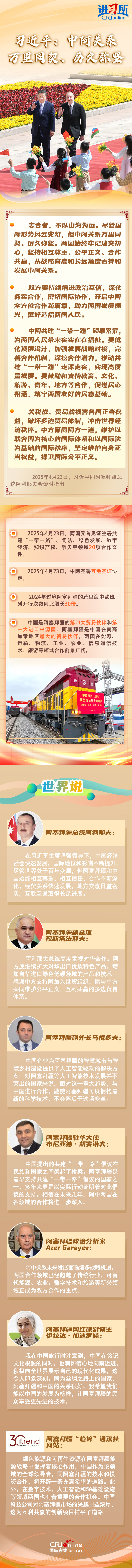 4月23日,中國國家主席習近平在北京同阿塞拜疆總統(tǒng)阿利耶夫舉行會談。兩國元首宣布,建立中阿全面戰(zhàn)略伙伴關系。習近平指出,盡管國際形勢風云變幻,但中阿關系萬里同契、歷久彌堅。雙方要持續(xù)增進政治互信,深化務實合作,密切國際協(xié)作,開啟中阿全方位合作新篇章,助力兩國發(fā)展振興,更好造福兩國人民。