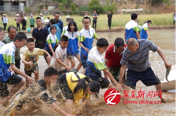 插秧比賽后緊接著開展了拔河比賽,參賽者們光著腳在泥濘的田里奮力拉扯,你來我往,互不相讓,田邊的觀眾則奮力地為自己支持的隊伍加油鼓勁。稻田抓鴨捕魚活動讓現(xiàn)場氣氛更加熱烈,觀眾紛紛脫下鞋襪,卷起褲腿,在稻田中追逐游魚和鴨子,歡快的笑聲此起彼伏。?