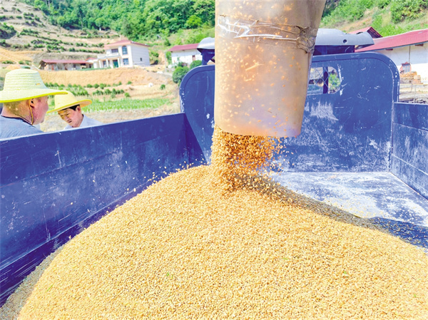 風(fēng)吹麥田千層浪,又到一年收獲時(shí)。在漢濱區(qū)晏壩鎮(zhèn)中心社區(qū)安康客意然農(nóng)業(yè)開發(fā)有限公司種植園區(qū)內(nèi),小麥在陽光的照耀下,閃著金燦燦的光芒,沉甸甸的麥穗隨風(fēng)搖曳,發(fā)出“沙沙”聲響。收割機(jī)正馬力全開,在金色麥浪中來回穿梭,伴隨著陣陣轟鳴聲,小麥從機(jī)艙中傾瀉而出,顆顆金黃、粒粒飽滿,裝滿車輛,整個過程一氣呵成,高效而精準(zhǔn)。