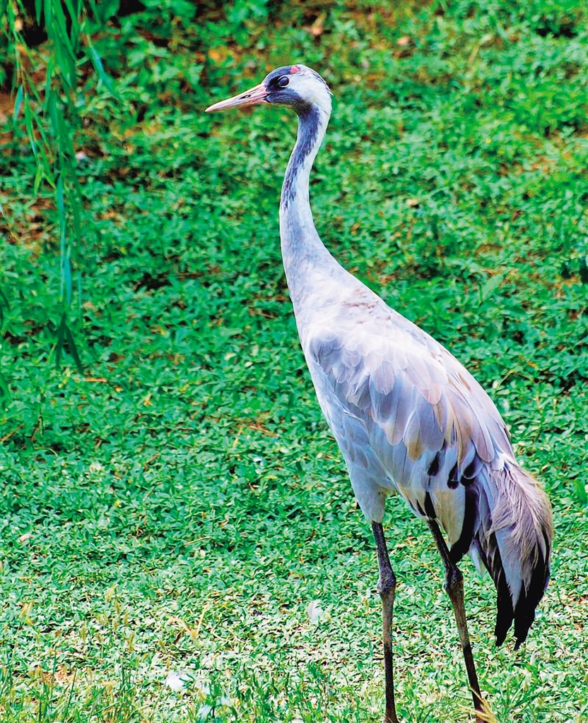 別名千歲鶴、玄鶴、番薯鶴、普通鶴、元鶴。通體羽色幾乎全為灰色;前額和眼先黑色,頭頂裸區(qū)部分呈朱紅色,喉、前頸和后頸灰黑色;自眼后有一道寬的白色條紋伸至頸背;眼虹膜紅褐色或深紅色;嘴暗綠色,先端顏色略淡;脛、跗跖及趾均為灰黑色。(來源:安康市林學(xué)會(huì))