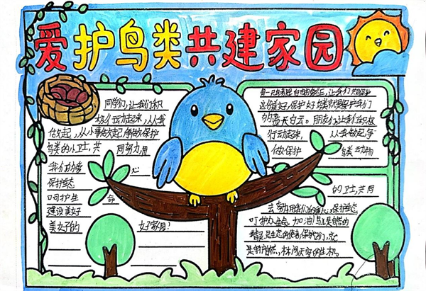 守護(hù)藍(lán)天精靈,共享美好家園!《安康高新區(qū)愛(ài)鳥(niǎo)護(hù)鳥(niǎo)倡議書(shū)》發(fā)布以來(lái),全區(qū)的孩子們積極行動(dòng),他們用畫(huà)筆以純真之心勾勒出對(duì)鳥(niǎo)兒的關(guān)愛(ài)與守護(hù)。他們把對(duì)鳥(niǎo)兒的喜愛(ài)融進(jìn)顏料,將守護(hù)的心愿畫(huà)入畫(huà)紙。稚嫩的筆觸下,有給小鳥(niǎo)搭建的溫暖巢穴,有禁止捕鳥(niǎo)的醒目標(biāo)語(yǔ),有鳥(niǎo)兒在藍(lán)天自由翱翔的愜意,有人類(lèi)與鳥(niǎo)兒和諧共處的溫馨,有孩子們與鳥(niǎo)兒牽手同行的幻想…… (通訊員 劉松)