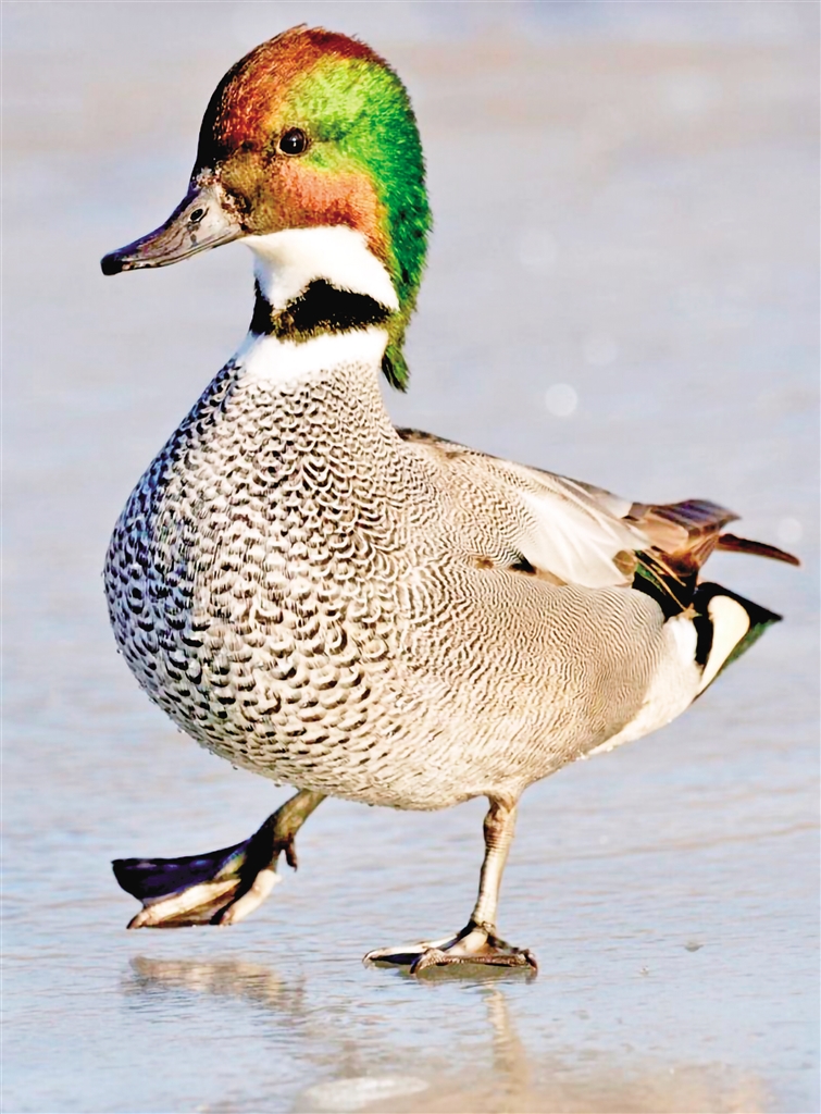 又名葭鳧、鐮刀鴨、扁頭鴨、早鴨、三鴨。雄鳥頭頂至后頸栗色,頭側(cè)及冠羽銅綠色;前頸基部有一黑色領(lǐng)環(huán),上體淺灰色,密布暗褐色波狀細(xì)紋;翼鏡綠黑色,三級飛羽延長呈鐮狀;胸黑色密布白色新月形斑,尾下覆羽絨黑色;兩側(cè)具乳黃色斑塊,腋下白色;雌鳥體羽多黑褐色而具黃褐色羽緣,形成明顯的“V”形斑;虹膜褐色,嘴黑灰色,腳暗灰色。因胸、腹、脅部密布由大漸小的黑白波紋,排列成有序的特異圖案,形似編織物而故名。