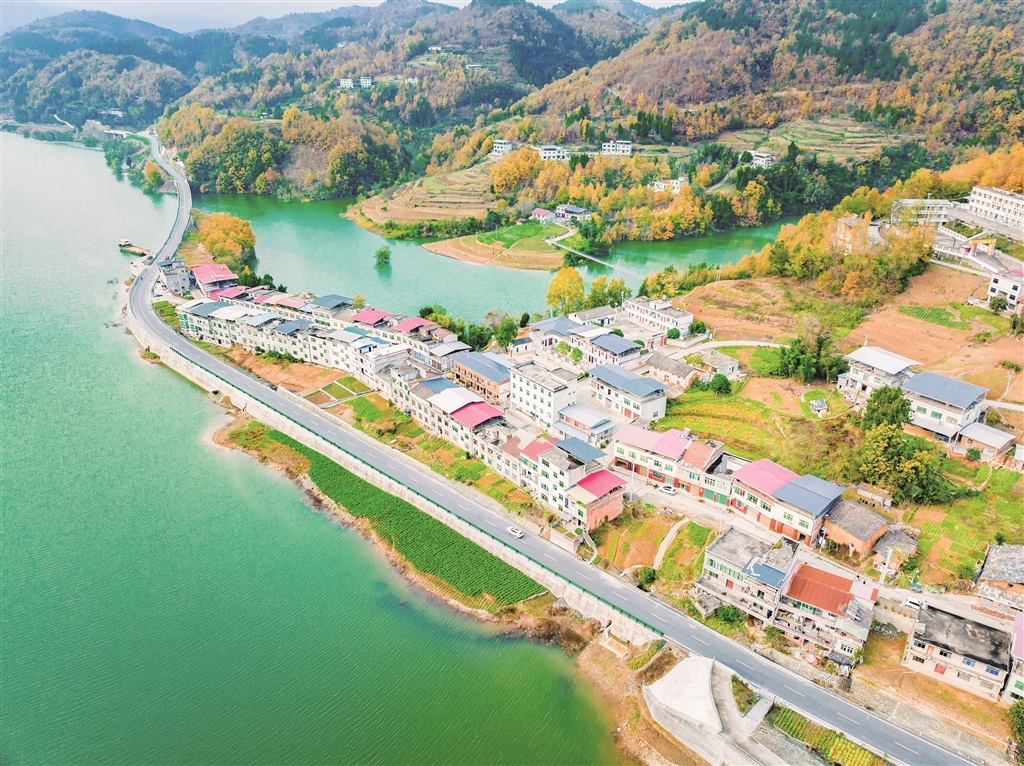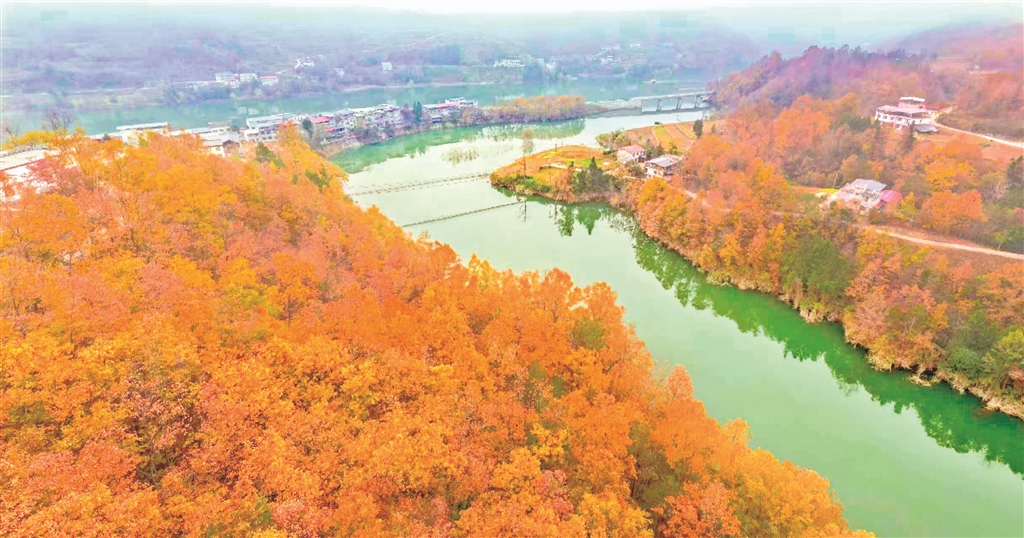 夕陽下的沙坪河,斑斕山林與澄澈水色繪就成一幅靈動(dòng)的水鄉(xiāng)畫卷。郭浩 攝