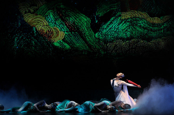 這是舞蹈詩劇《只此青綠》的演出劇照(2024年7月18日攝)?!吨淮饲嗑G》采用平行空間的敘事方式,從故宮博物院青年研究員的“展卷人”視角出發(fā),講述北宋著名畫家王希孟創(chuàng)作《千里江山圖》的故事。該劇連續(xù)3年穩(wěn)居中國舞劇票房榜首,全國巡演超800場,赴多個國家和地區(qū)演出50余場,成為傳統(tǒng)文化創(chuàng)新表達、中國藝術國際表達的典范之作。