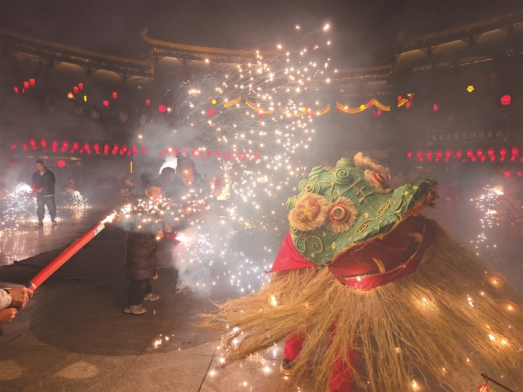 2月19日,石泉縣秦巴風(fēng)情園里的“燒獅子”引得眾人圍觀。舞獅人配合默契,游客點(diǎn)燃煙花筒,現(xiàn)場(chǎng)火花四濺、氣氛熱烈。楊勇 攝