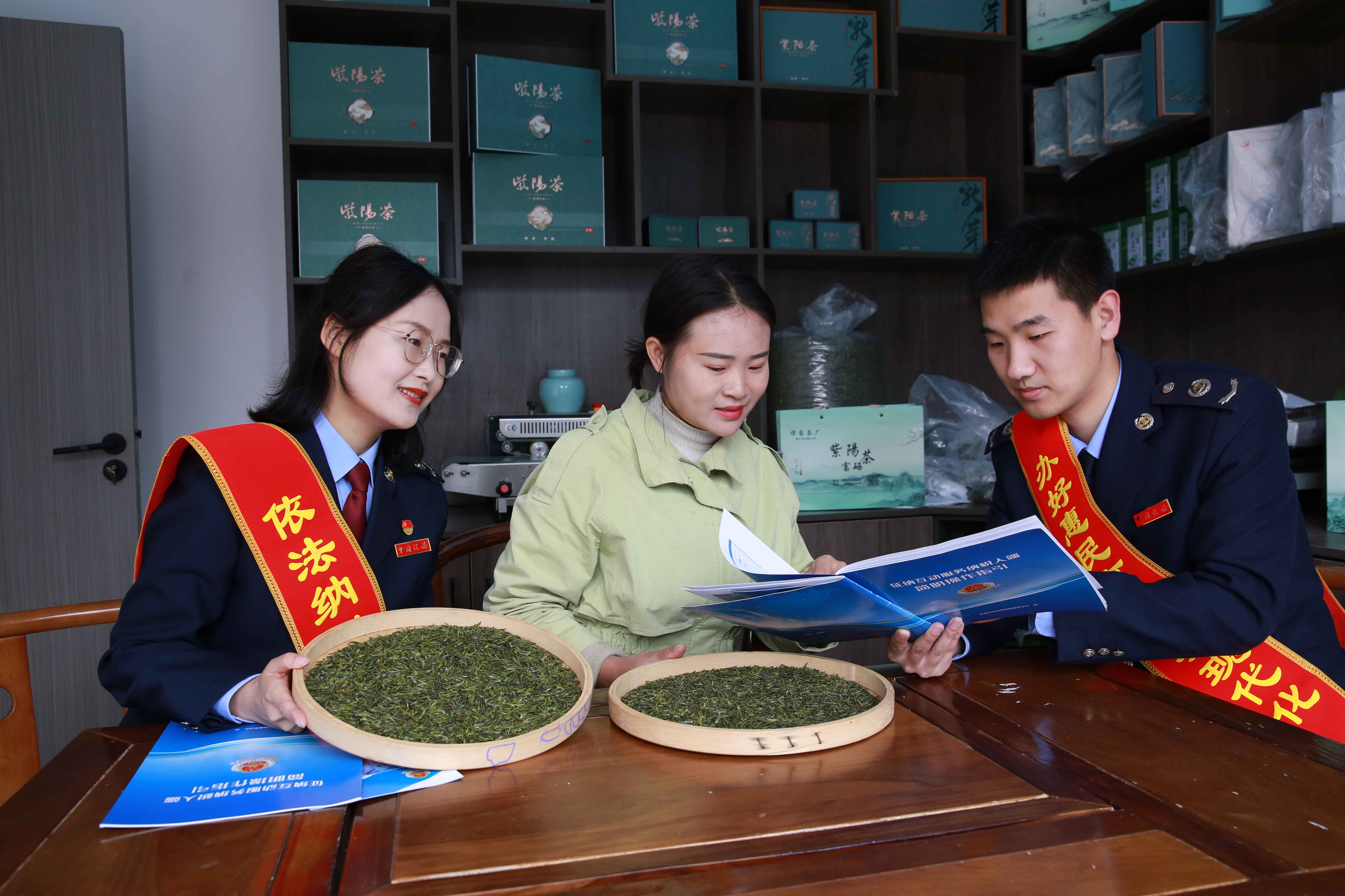 紫陽縣稅務(wù)工作人員向茶葉企業(yè)講解政策