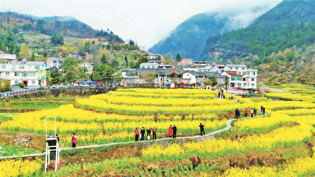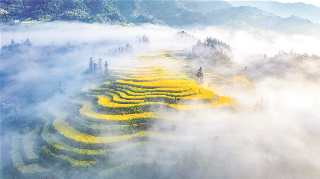 沿著蜿蜒的山路盤旋而上,轉過一個山坳,眼前豁然開朗——那金黃的油菜花,竟從山腳一直鋪到云端。層層疊疊的梯田,依著山勢盤旋而上,每一道田埂都勾勒出柔美的曲線。油菜花便順著這些曲線,開得浩浩蕩蕩,開得理直氣壯。晨霧未散時,花海在薄紗般的霧氣里若隱若現(xiàn),恍若仙境;待太陽升高,霧氣褪去,那金黃便愈發(fā)耀眼,直晃得人瞇起眼睛。風過處,花浪翻涌,從這山傳到那山,沙沙的聲響里,滿是春天的氣息。