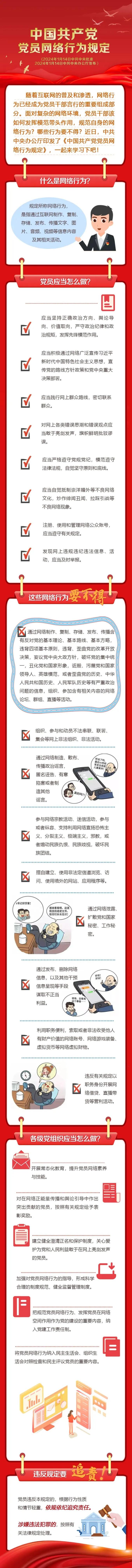 《中國共產(chǎn)黨黨員網(wǎng)絡(luò)行為規(guī)定》于2024年1月14日經(jīng)黨中央批準、辦公廳發(fā)布后同日施行,它是第一部規(guī)范黨員網(wǎng)絡(luò)行為的黨內(nèi)法規(guī),是全體黨員使用網(wǎng)絡(luò)的根本遵循,共計5章31條。