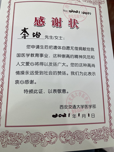 15年來,李治還積極資助困難學生、為災區(qū)捐資捐物,為他人、為社會付出了很多,但他總覺得不夠。2021年,他自愿申請并成功登記為遺體捐獻志愿者。“這是我那年送給自己的新年禮物。”他指著西安交通大學醫(yī)學部的感謝狀說。