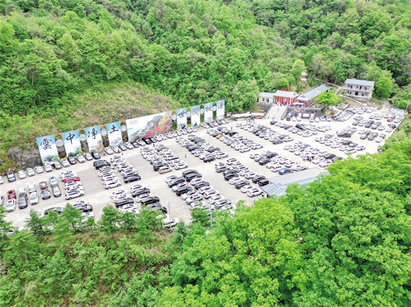“五一”假期,嵐皋縣南宮山景區(qū)持續(xù)火爆。圖為“滿員”的北線停車場(chǎng)。 陳陽(yáng) 攝