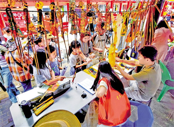 “五一”假期,安康非遺文化展示活動(dòng)在漢濱區(qū)老城街道民俗夜市長(zhǎng)廊舉辦,安康皮影吸引游人駐足欣賞。吳定國(guó) 攝