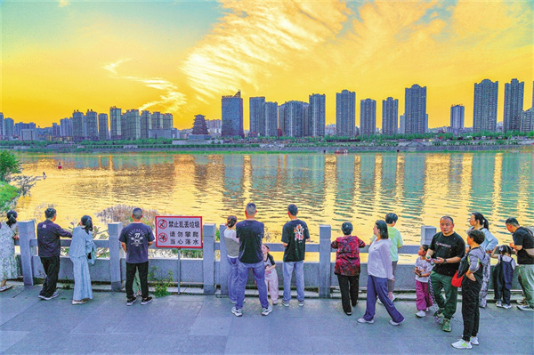 5月2日,天邊的云彩被夕陽(yáng)染成了暖黃色,與江水的波光相互輝映,構(gòu)成了一幅絕美的畫(huà)卷。圖為安康城區(qū)濱江公園的步道上,眾多游客在享受愜意的時(shí)光。皮勇維 攝