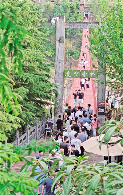 好山好水迎客來(lái)。5月3日,各地游客在紫陽(yáng)縣陜甘茶馬古道景區(qū)打卡游玩。圖為游客在服務(wù)人員的引導(dǎo)下有序排隊(duì),依次踏上景區(qū)內(nèi)的凌空索橋。儲(chǔ)茂銀 攝