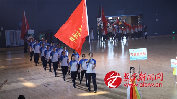 開幕式在暖場節(jié)目《幸福安康》的表演中拉開序幕。伴隨著高昂而優(yōu)美的旋律,儀仗隊隊員護擁著會旗與代表本屆市運會核心主題的標語隊步伐矯健地入場。由全市教育、體育、科技、文化、衛(wèi)生五大領域的杰出代表組成的觀禮團代表從主席臺前走過。緊隨其后的裁判員隊伍、13個青少年組運動員代表團、32 個行業(yè)組運動員代表團闊步入場,展現(xiàn)出朝氣蓬勃的精神風貌。入場儀式完畢,全場起立,面向國旗,奏唱中華人民共和國國歌。運動員代表與裁判員分別宣誓。
