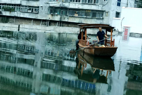 工作人員在寧陜縣長安河清理河內(nèi)垃圾。 王輝 攝