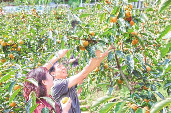 10月8日,游客在石泉縣城關(guān)鎮(zhèn)絲銀壩村脆甜柿子果園體驗采摘樂趣。許兵 攝