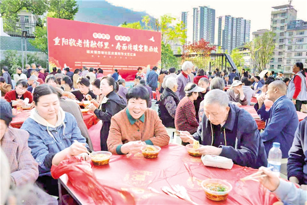 10月28日,嵐皋縣城關(guān)鎮(zhèn)西坡社區(qū)舉辦了“重陽(yáng)敬老情融鄰里·壽面?zhèn)髋缇畚髌?rdquo;主題活動(dòng)。廖霖 攝