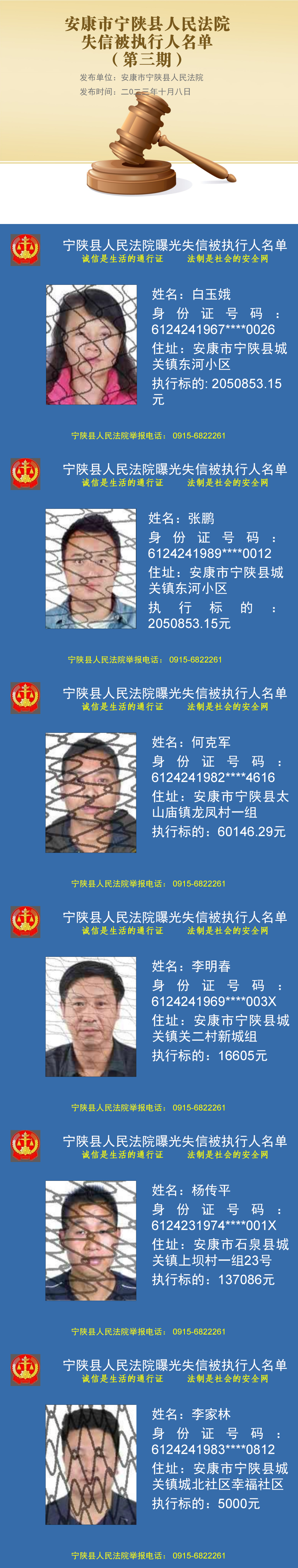 為維護(hù)司法權(quán)威,推動(dòng)社會(huì)誠信體系建設(shè),促使被執(zhí)行人履行生效法律文書確定的義務(wù),根據(jù)《中華人民共和國民事訴訟法》第二百五十五條和《最高人民法院關(guān)于公布失信被執(zhí)行人名單信息的若干規(guī)定》的規(guī)定,被執(zhí)行人具有履行能力而不履行生效法律文書確定的義務(wù),人民法院應(yīng)當(dāng)將其納入失信被執(zhí)行人名單,依法對(duì)其進(jìn)行信用懲戒,F(xiàn)將安康市寧陜縣人民法院2023年第三期失信被執(zhí)行人名單予以公布。