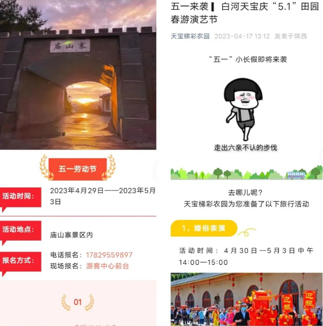 景區(qū)景點(diǎn)開(kāi)放到位。“五一”期間,3家A級(jí)景區(qū)景點(diǎn)全部正常開(kāi)放。其中天寶4A景區(qū)從4月29日至5月3日籌備舉辦田園春游演藝節(jié)系列活動(dòng),推出門(mén)票七折優(yōu)惠措施;廟山寨3A景區(qū)將舉辦“廟山”好聲音、攀巖比賽等節(jié)慶活動(dòng),推出138元游玩通票打五折、門(mén)票+餐飲立減等優(yōu)惠措施。