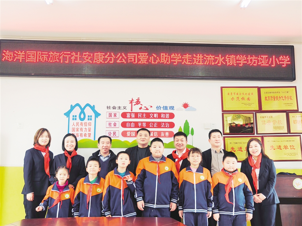 捐贈儀式上,學(xué)坊埡小學(xué)少先隊員為海洋國際旅行社安康分公司的愛心人士系上紅領(lǐng)巾,歡迎他們的到來。隨后,愛心人士們把一份份愛心大禮包送到孩子們手中,鼓勵他們克服困難、努力學(xué)習(xí)。孩子們感動之余紛紛表示,一定珍惜這份來自社會大家庭的關(guān)愛,將會更加努力學(xué)習(xí),力爭早日成為國家有用之才。據(jù)了解,此次活動海洋國際旅行社安康分公司共為學(xué)坊埡小學(xué)捐贈助學(xué)物資近萬元,其中包括秋季校服、學(xué)習(xí)用品及愛心大禮包等,惠及該校多名學(xué)生。