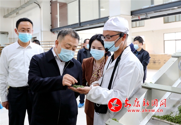 市長(zhǎng)武文罡(左二)在長(zhǎng)安鎮(zhèn)田珍茶業(yè)調(diào)研茶葉生產(chǎn)加工情況(攝影:李世鋒)