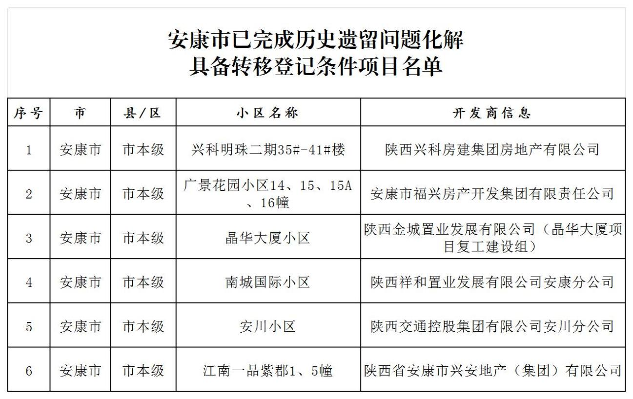 安康市市本級(jí)已完成住房領(lǐng)域不動(dòng)產(chǎn)“辦證難”問題化解具備轉(zhuǎn)移登記條件項(xiàng)目名單的公告
