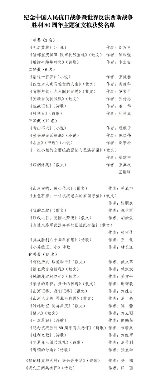 紀念中國人民抗日戰(zhàn)爭暨世界反法西斯戰(zhàn)爭勝利80周年主題征文評審結(jié)果公示