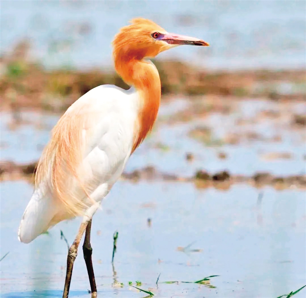 夏羽大都白色;頭和頸橙黃色,前頸基部和背中央具羽枝分散成發(fā)狀的橙黃色長(zhǎng)形飾羽;前頸飾羽長(zhǎng)達(dá)胸部,背部飾羽向后長(zhǎng)達(dá)尾部,尾和其余體羽白色。冬羽通體全白色,個(gè)別頭頂綴有黃色,無(wú)發(fā)絲狀飾羽。橙黃色的喙長(zhǎng)、尖而直,較側(cè)扁、尖端多有小鋸齒;翅較寬長(zhǎng),前頸的基部和背部中央具有羽枝分散成發(fā)狀的橙黃色長(zhǎng)飾羽、前頸的飾羽長(zhǎng)達(dá)胸部,背部的飾羽向后長(zhǎng)達(dá)尾部。牛背鷺喜歡站在牛背上或跟隨在耕田的牛后面啄食翻出來(lái)的昆蟲(chóng)和牛背上的寄生蟲(chóng)等,因此得名。(來(lái)源:安康市林學(xué)會(huì))