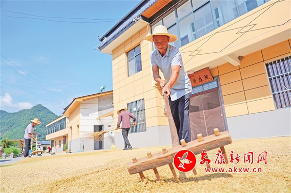 嵐皋縣南宮山鎮(zhèn)桂花村村民利用晴好天氣晾曬谷物。張鑫 攝kY4安康新聞網(wǎng)