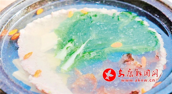 “白火石汆湯是我跟我祖父和父親學(xué)的手藝,13歲開始學(xué)做廚,白火石汆湯里面主要用到新鮮的豬肉,加蔥姜、蛋清、鹽、雞精以及料酒、生粉、蛋清,將其剁成肉泥,貼到陶盆里面,上厚下薄,里面陸續(xù)放上木耳、小青菜、豆腐,然后把石頭燒紅之后放進陶盆內(nèi)的紗布中,只消幾分鐘,一道美味可口的白火石汆湯便做好了。”解遠平一邊準備食材,一邊向筆者介紹著白火石汆湯的做法。