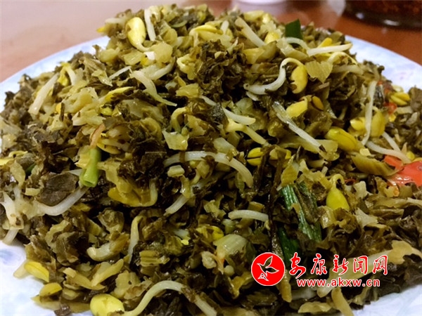 兩摻面摻好后醒的過(guò)程中,從酸菜壇子里撈出清亮的酸菜,配蒜瓣、姜末、蔥段、蒜苗、干辣子為佐料,韭菜、豆芽為輔料,一起下鍋炒熟,地道的安康酸菜出鍋,靜候與兩摻面的相逢。