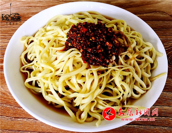 在恒口,涼面作為大眾面食,家里來了客人,主婦都會做涼面招待。搟一案子面,切成筷子寬的長條,下鍋煮開就撈,滴上香油,快速挑起用扇子扇涼,配上幾個可口的素菜就齊活了。醋湯、油潑辣子、青辣大蒜,還有花生碎。雖然調(diào)料不多,但每一樣都很講究。醋汁需用十幾種大料熬制,要保證每次熬出的醋湯味道一致,大料要精確比例。油潑辣子要選用上等干辣椒,炕干再配上調(diào)料打碎。每一樣精心調(diào)制的配料要達到色香味俱全,構(gòu)成了傳統(tǒng)涼面的精髓。