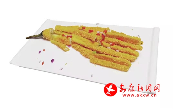 推薦理由:這道菜選用長(zhǎng)形的紫氣皮茄子,削皮后橫豎刀切成佛手狀的粗條,均勻給每一根茄條拍上調(diào)味后的干淀粉、抹上雞蛋液,再裹上一層面包糠,下油鍋炸至表皮金黃,切成長(zhǎng)短適合入口的大小,點(diǎn)綴上洋蔥碎和辣椒丁便可擺盤上桌了。菜品顏色金黃燦爛,看一眼便讓人食欲大開,夾一塊送入嘴中,外皮酥脆化渣,內(nèi)部是茄肉的軟嫩多汁,茄子的香味透過面包糠的油香層層滲入口腔,余味悠長(zhǎng),是一道老少皆宜的美味佳肴。RY7安康新聞網(wǎng)