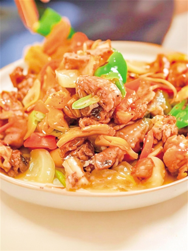 曬干的土豆片用水泡發(fā)喚醒,這看似簡單的步驟暗藏玄機。浸泡時間短則發(fā)硬,久則軟爛,唯有經(jīng)驗老到的廚娘能把握分寸。“復(fù)活”的土豆片帶著陽光的甘甜與泉水的清冽,在雞肉煸出琥珀色時傾入鍋中,與郫縣豆瓣醬、蒜頭姜片共舞。當(dāng)褐紅色的醬汁裹滿每塊食材,撒入的野蔥段。炒好裝盤,色澤焦黃的雞肉混合著金黃的土豆片,點綴著翠綠的野蔥段,紅亮的醬汁如絲般纏繞其間,讓人垂涎欲滴。雞肉外皮酥脆而內(nèi)里肉質(zhì)鮮嫩多汁,與土豆片的軟糯完美融合,帶來層次分明的口感享受。辛香與醬香交織,激發(fā)著味蕾的無限遐想,讓人一嘗難忘,也成了安康人飯桌上一道備受歡迎的美食。