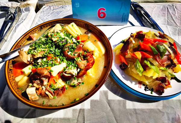 吊罐燉豬蹄、洋芋粑粑炒臘肉、小白菜煎豆腐、油洋芋燜米飯……蔬菜現(xiàn)摘,土灶現(xiàn)炒,廚師把鍋顛得火星四射,一會兒工夫,一大桌質(zhì)樸家常卻極具當?shù)靥厣募央,就…?/div>